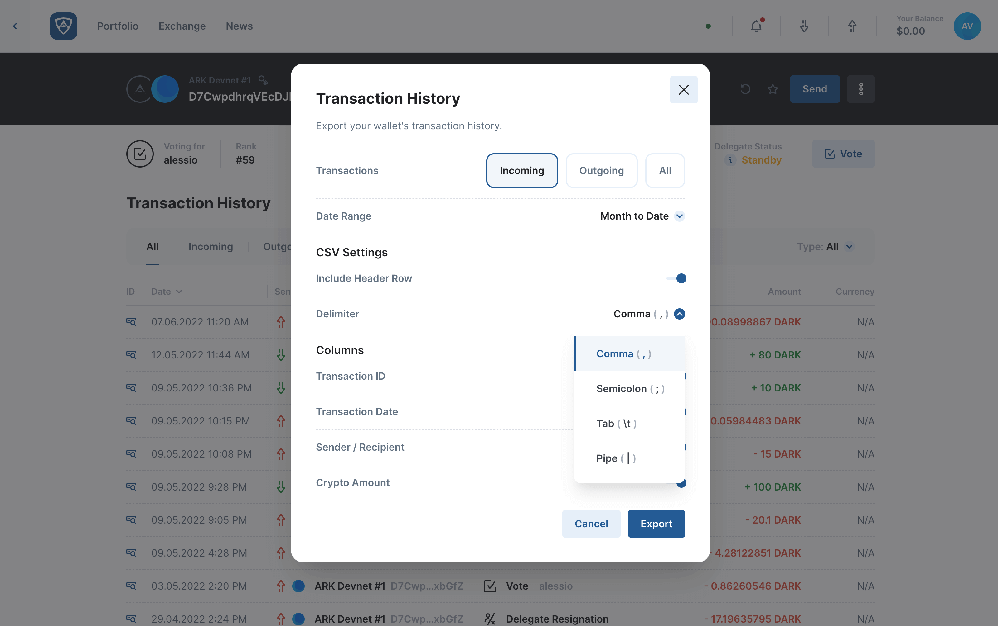 ARKVault allows you to export a wallet’s transaction history according to a number of preset parameters or between any two dates. Moreover, it also allows you to include or exclude certain information and choose from some formatting options, resulting in a custom record of a wallet’s transactions that you can access via a convenient CSV file. The following information will explain how to: